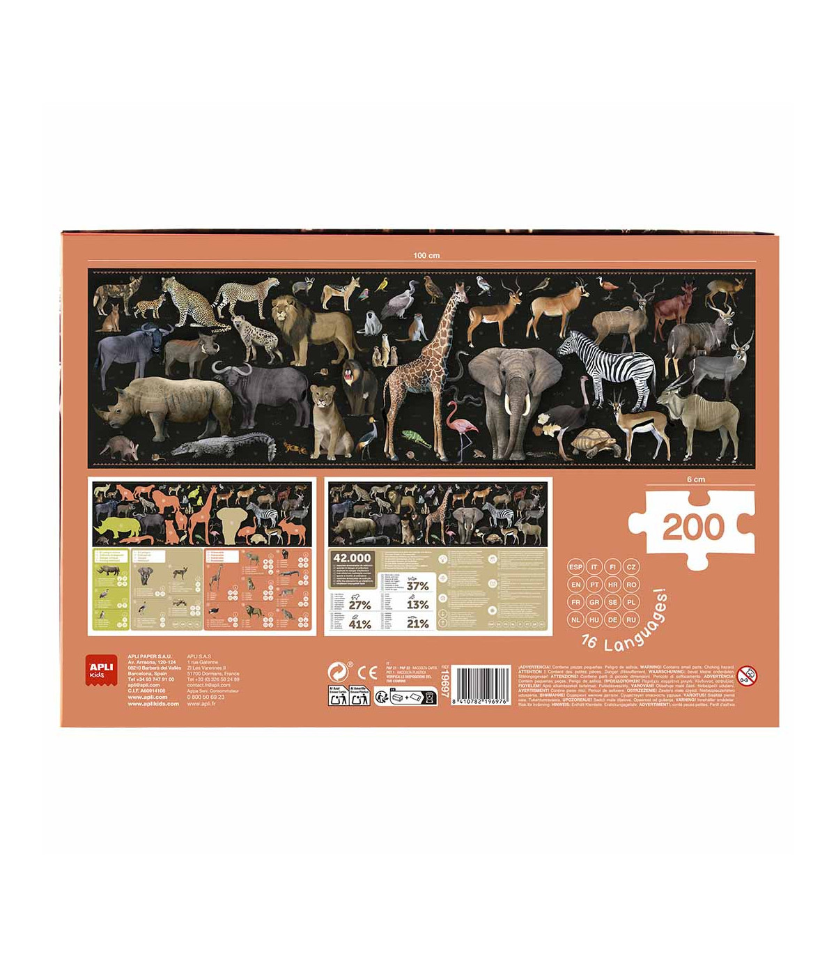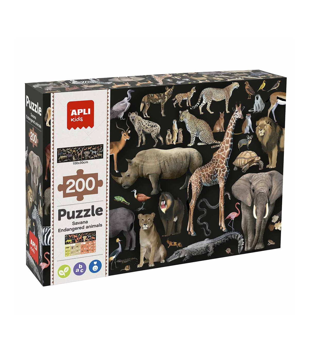 Puzle Animales amenazados Sabana para identificar las especies en extinción y crear conciencia en los más pequeños acerca de la importancia de cuidar el ecosistema. Incluye 200 piezas de tamaño 6 x 6 cm y 2 fichas con información sobre las especias amenazadas y las razones de su situación en 16 idiomas distintos. Una vez construido el puzle, los niños aprenderán acerca la sabana. Tamaño del puzle es 100 x 30 cm. Los puzles ayudan a mejorar y desarrollar multitud de capacidades y habilidades: mejoran su concentración, la observación, la memoria y la resolución de problemas; y desarrollan la percepción espacial, la psicomotricidad fina, el reconocimiento de formas y la coordinación mano-ojo. Recomendado para niños a partir de 6 años.