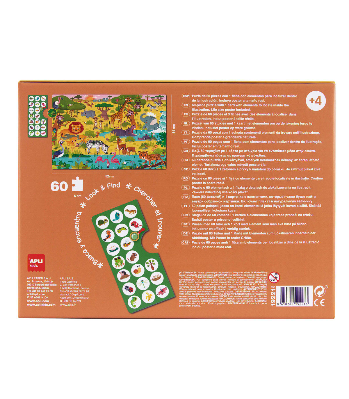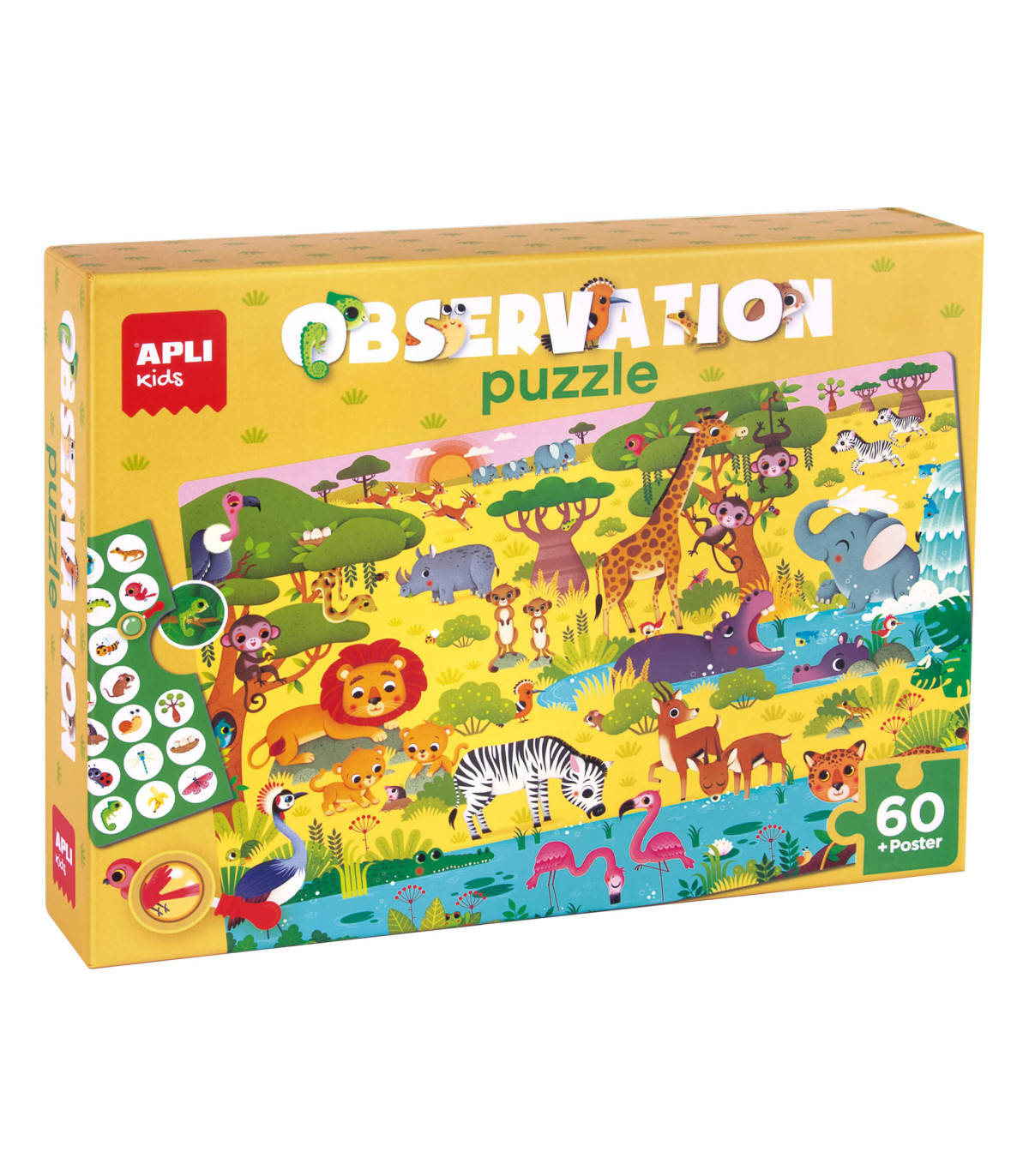 Puzle de observación con temática de la Jungla. Incluye 60 piezas de tamaño 6 x 6 cm. Tamaño del puzle: 52 x 34 cm. Contiene un póster de tamaño real para facilitar el montaje y 1 ficha con diferentes objetos. Una vez el puzle esté montado, los niños deberán encontrar los objetos de las fichas dentro de la imagen del puzle. Diseño exclusivo APLI Kids: infantil, colorido, claro y simple. Fácil manejo para los más pequeños: piezas resistentes, seguras y fáciles de manejar. Cartón de 2 mm de grosor con acabado mate e indiana en el dorso. Los puzles son el juego ideal para los niños ya que, mientras se divierten jugando, les ayudan a mejorar y desarrollar multitud de capacidades y habilidades: mejoran su concentración, la observación, la memoria y la resolución de problemas; y desarrollan la percepción espacial, la psicomotricidad fina, el reconocimiento de formas, la coordinación mano-ojo y las habilidades matemáticas. Además, los puzles les ayudan a mejorar su autoestima y motivación gracias al hecho de terminar un juego con éxito. ¡El regalo ideal para los más pequeños de la casa! Recomendado para niños a partir de 4 años.