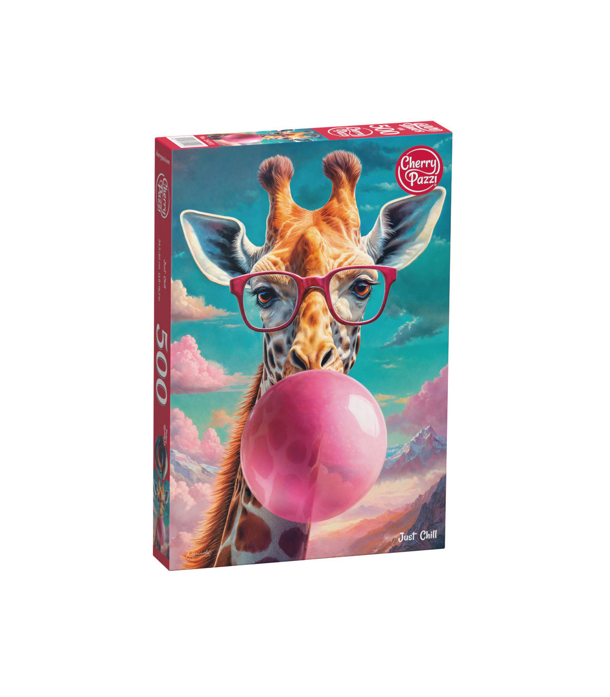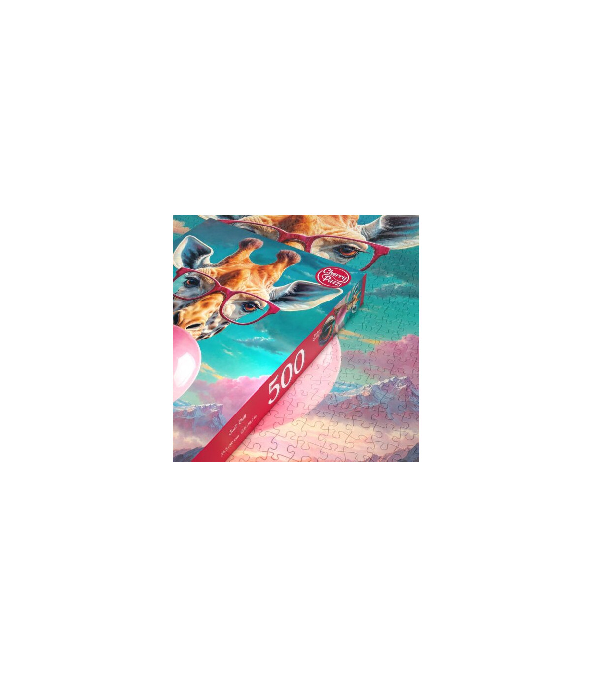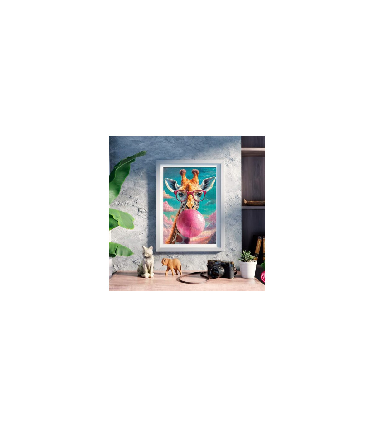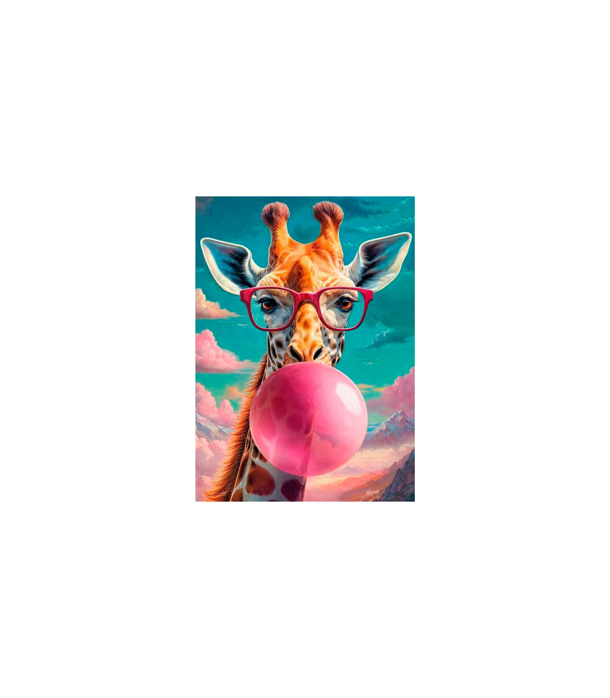 Una jirafa con gafas sopla un globo de color rosa chicle y sus divertidas travesuras se sitúan en un contexto de nubes de algodón de azúcar. Es un momento alegre capturado en colores vivos, donde la imaginación vuela y las preocupaciones se disuelven en el encanto despreocupado de la escena.