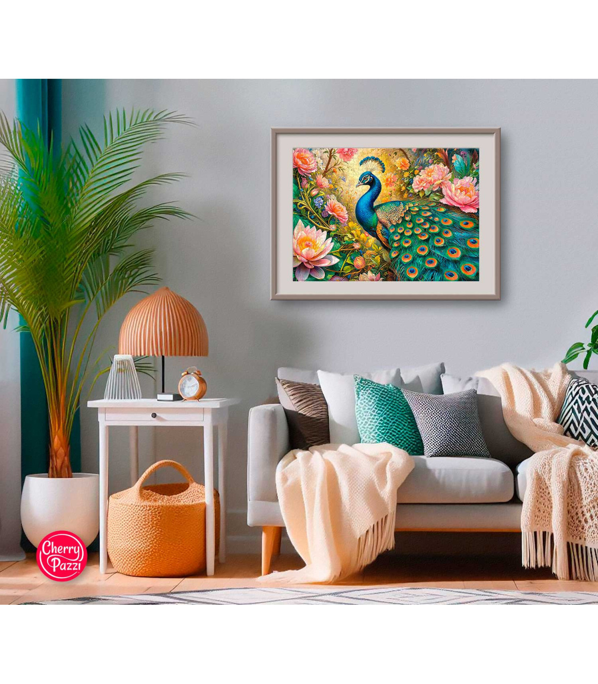 El pavo real, símbolo de belleza y gracia, se encuentra orgulloso con su plumaje verde y dorado en plena exhibición. Las flores están intrincadamente pintadas en colores suaves y pastel que contrastan maravillosamente con la vivacidad de las plumas oculares. Este rompecabezas no sólo muestra la elegancia, el esplendor natural y el suave resplandor del pavo real, sino que también evoca una sensación de serenidad y admiración por el mundo natural.
