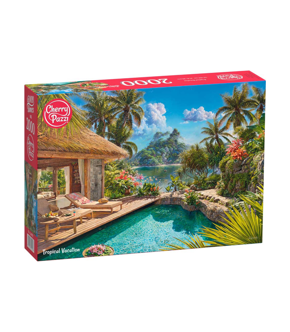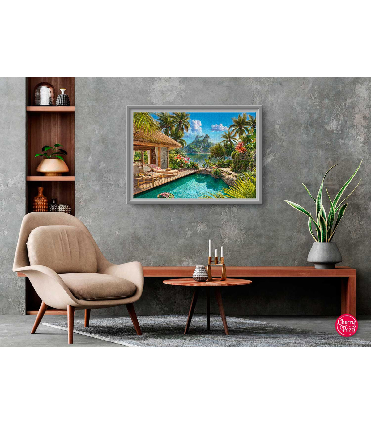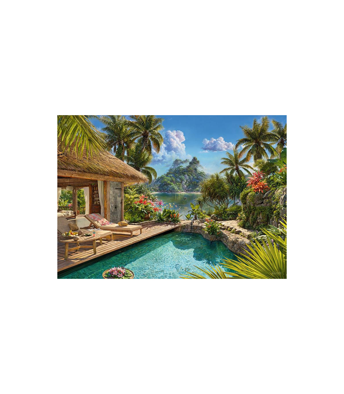 Este rompecabezas es a la vez pintoresco y calmante, evocando una sensación de paraíso y escapar de la vida cotidiana. Un acogedor bungalow y refrescos tropicales invitan a relajarse. Los puzzles transmiten una escapada tropical perfecta, ofreciendo la combinación ideal de belleza natural y relajación. Un sueño al alcance de la mano.
