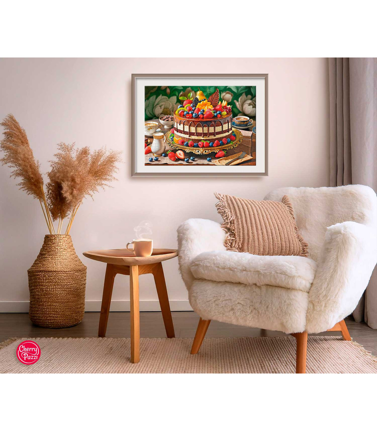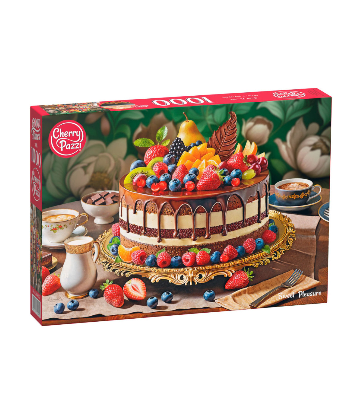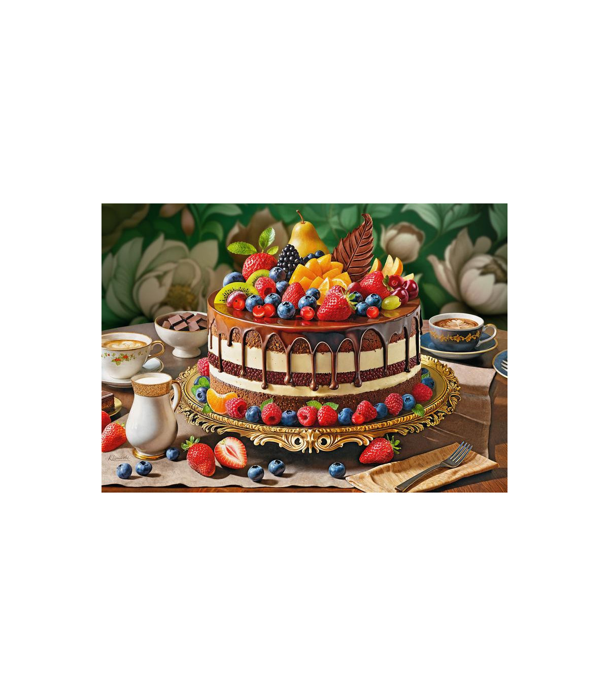El rompecabezas con la imagen de este delicioso pastel de chocolate cubierto con glaseado de chocolate y decorado con abundantes frutas representa un verdadero y dulce placer.