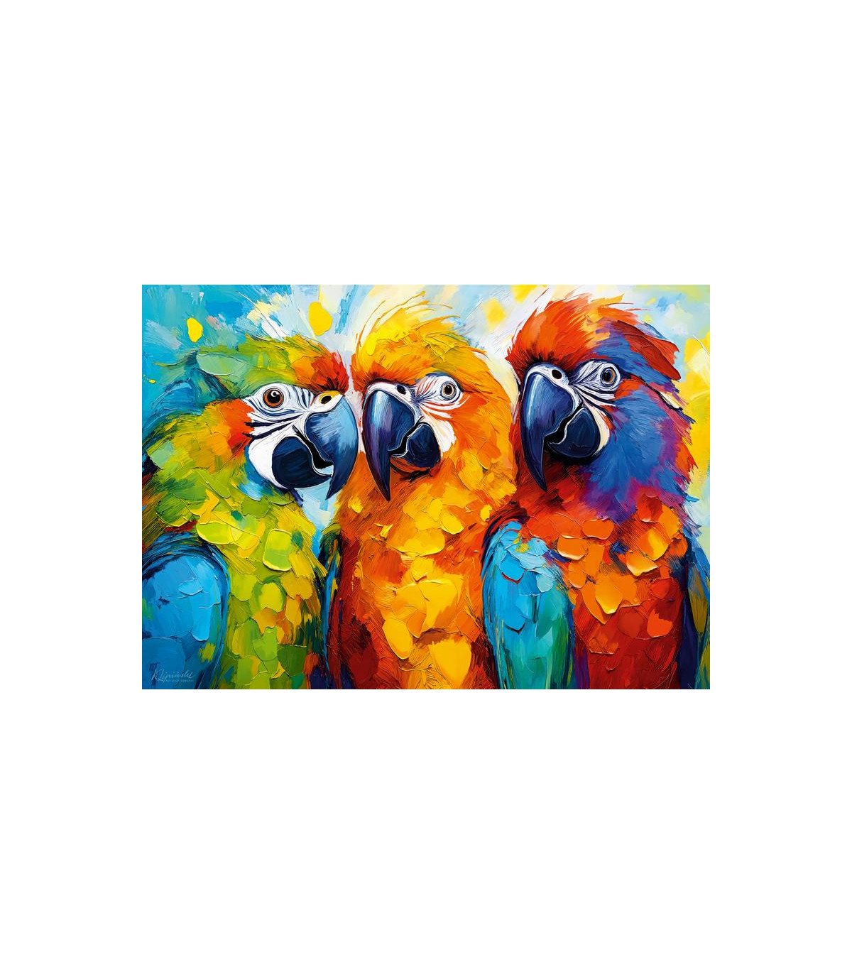 Rompecabezas impresionista de tres majestuosos loros guacamayos.