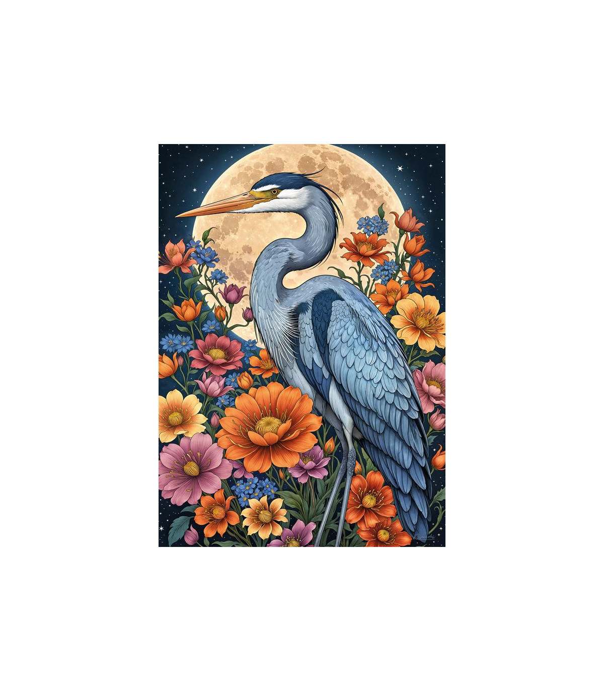 Un sereno paisaje nocturno lunar donde una grácil garza como símbolo de elegancia y quietud se encuentra en medio de flores en flor,
