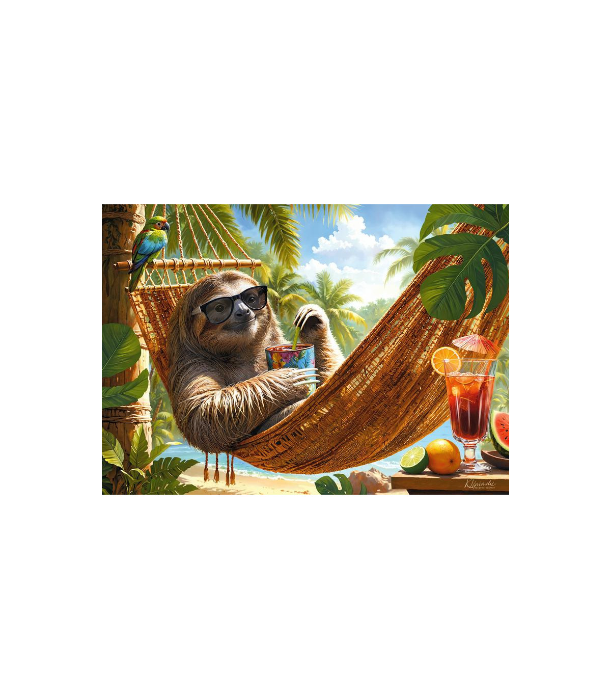Una pintura encantadora de este lindo perezoso, recostado perezosamente en una hamaca, rodeado de un paisaje tropical.