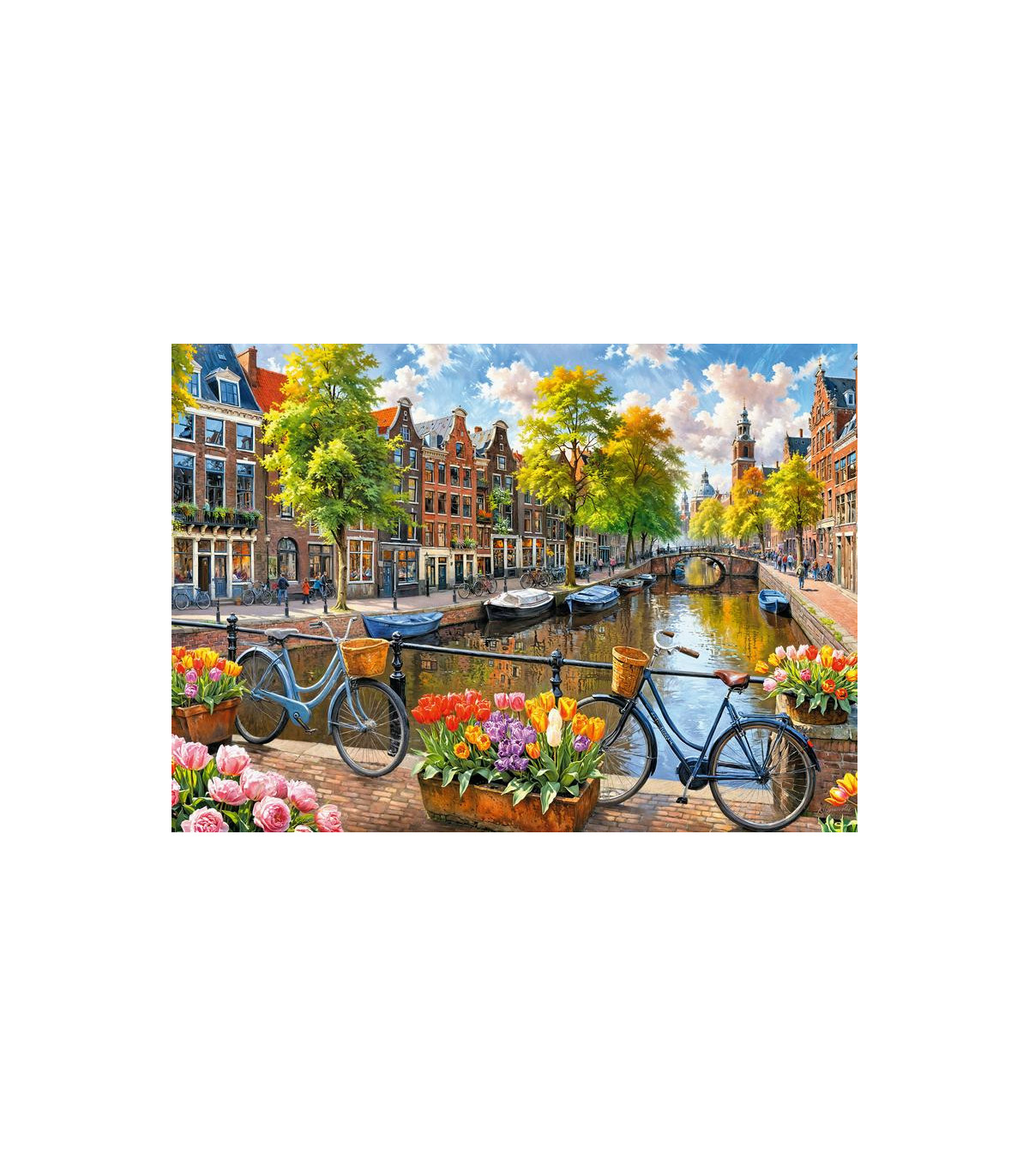 La pintura representa la icónica Ámsterdam, canales, bicicletas y tulipanes.