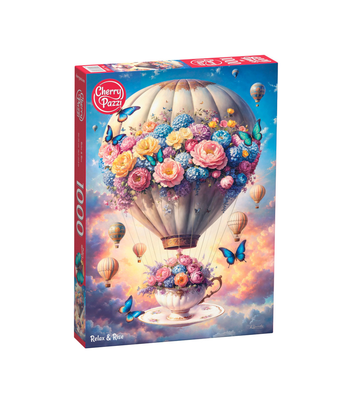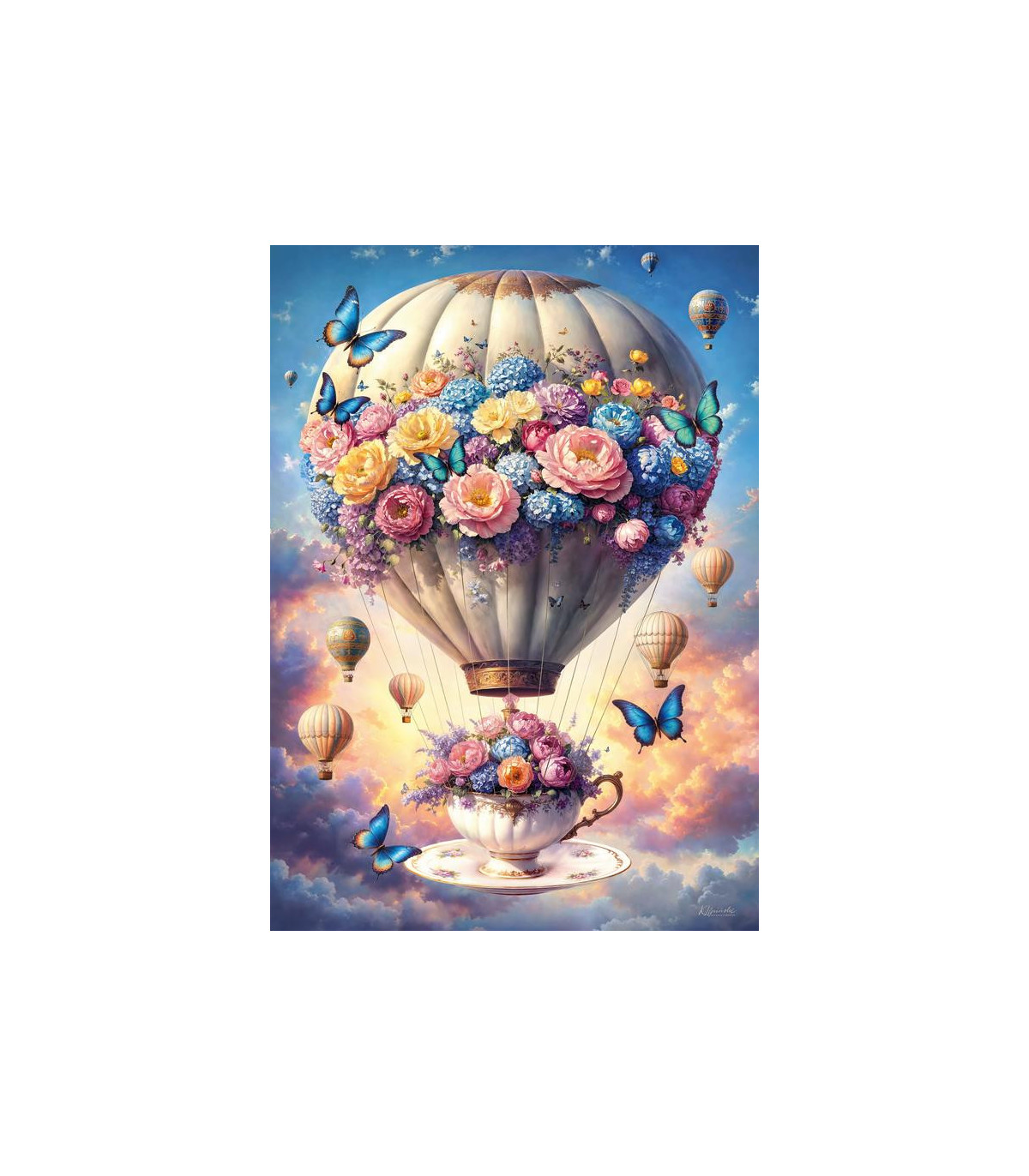 Flote en un sueño color pastel con un globo aerostático, mariposas, flores y una acogedora taza de té.