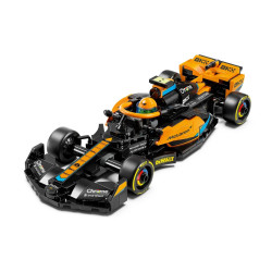 El modelo del vehículo McLaren incluye numerosas características de gran realismo: los colores distintivos negro y papaya, los logotipos de los patrocinadores del equipo, las ruedas con el nombre de Pirelli y el halo de seguridad papaya. El coche de este kit construible viene con una minifigura de un piloto.
