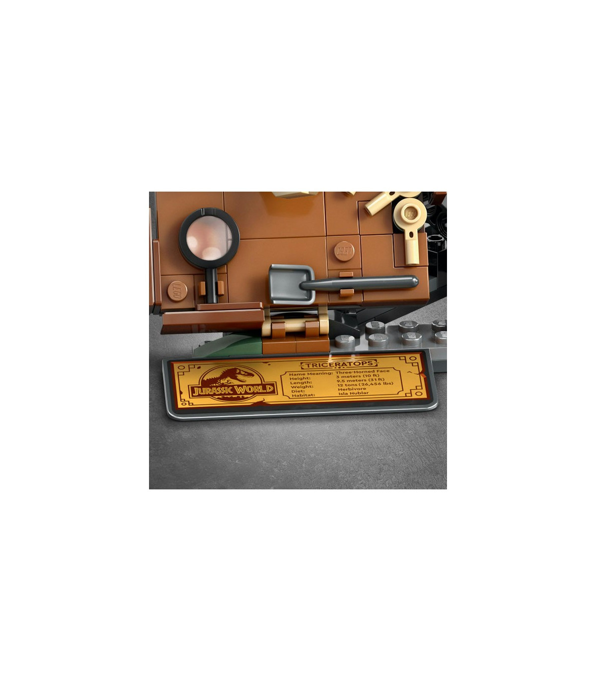 • Kit deconstrucción de dinosaurios: Cuenta con un cráneo de Triceratops con base, placa informativa, lugar de excavación con minifósiles y herramientas, minifigura LEGO® de un aprendiz de paleontólogo y una pieza de “ámbar”