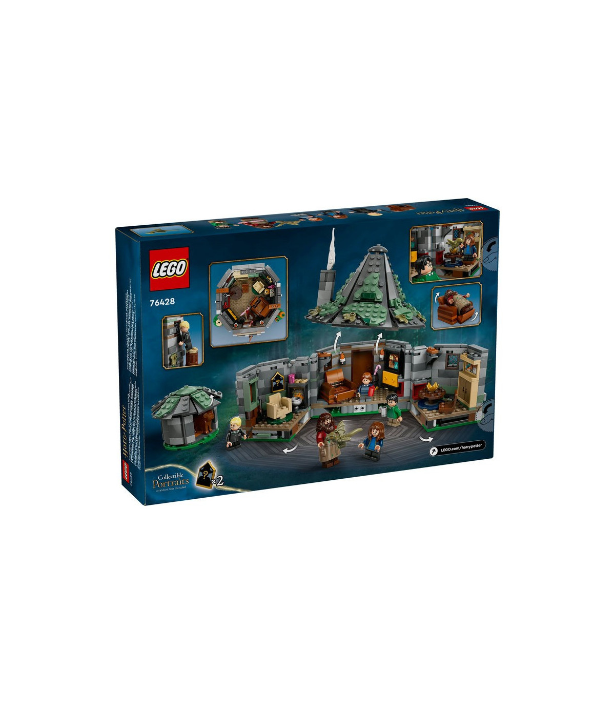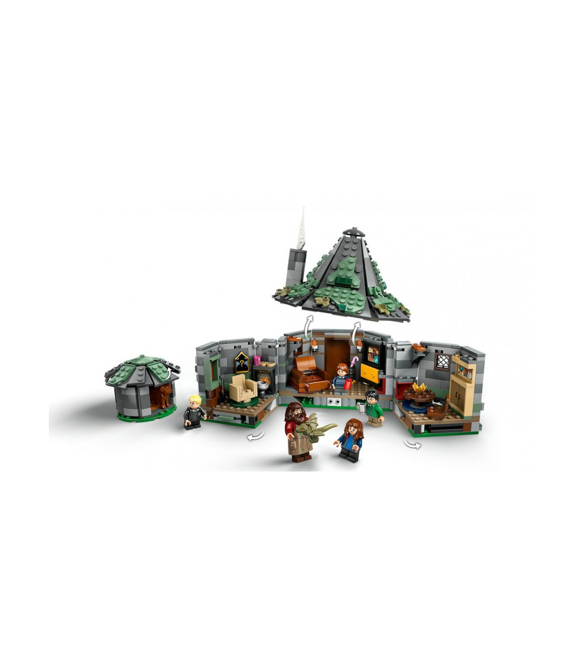 • Una cabaña y una caseta construibles: La cabaña cuenta con techo desmontable y se abre para jugar con facilidad; el detallado interior incluye el sillón de Hagrid, un paragüero y un huevo de dragón