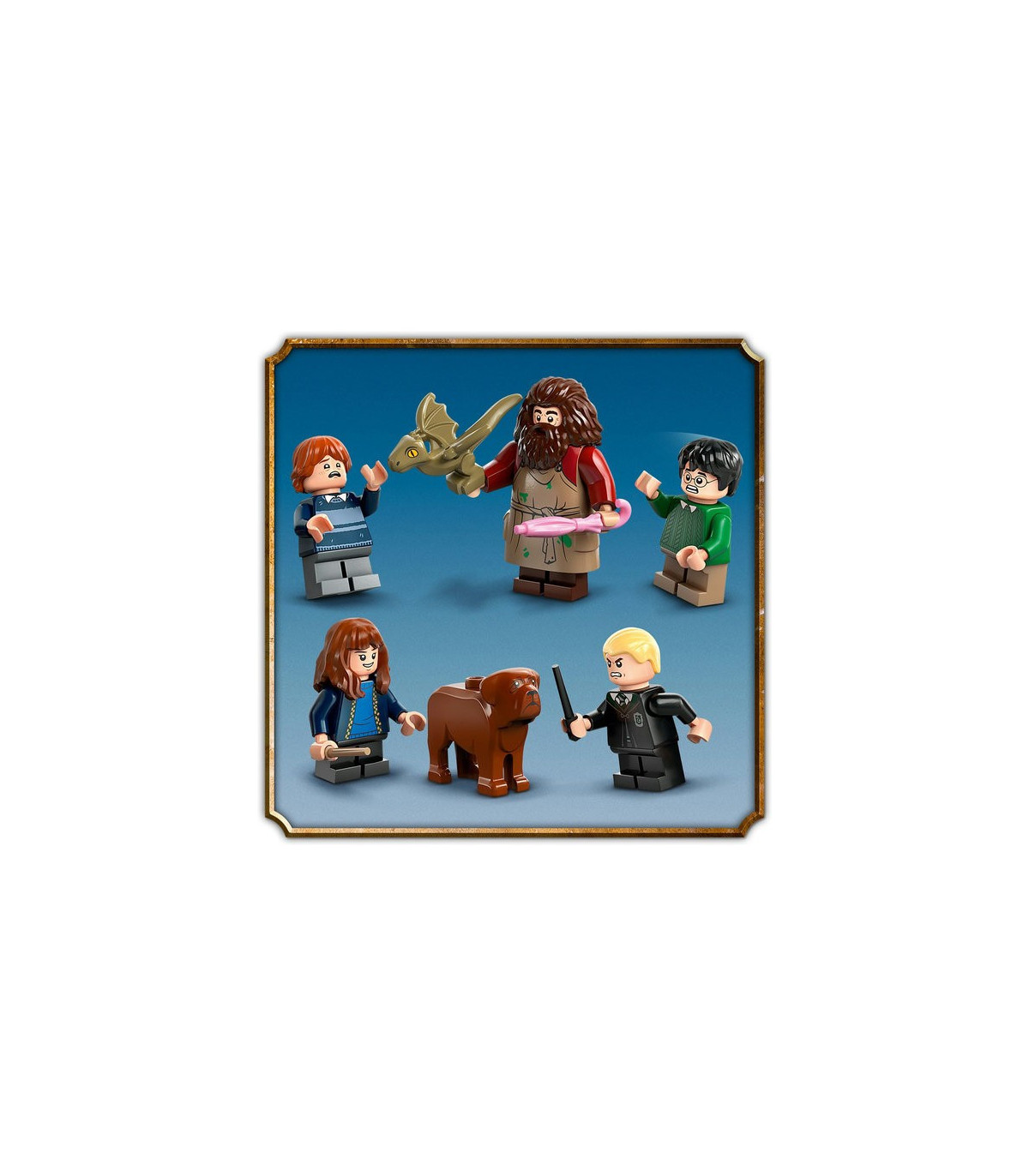 • 7 personajes LEGO® Harry Potter™: Minifiguras de Harry Potter, Hermione Granger™, Ron Weasley™, Draco Malfoy™ y Rubeus Hagrid™, así como figuras LEGO del dragón Norberto y de Fang, el perro de Hagrid