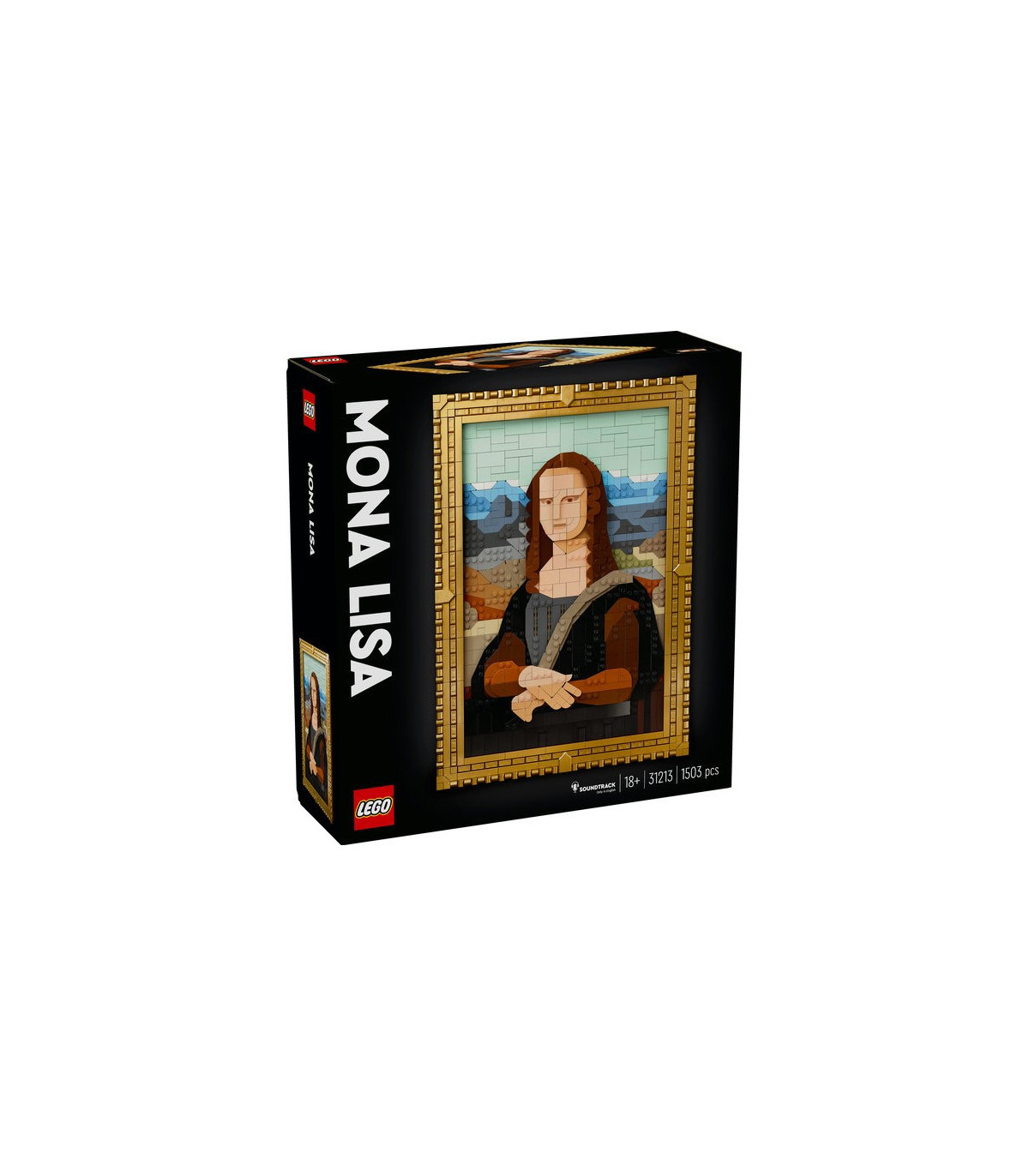 • Marco desmontable: Esta idea de decoración mural inspirada en la Mona Lisa está colocada en un marco dorado que puedes usar para exponer otras obras LEGO® Art de tu colección
