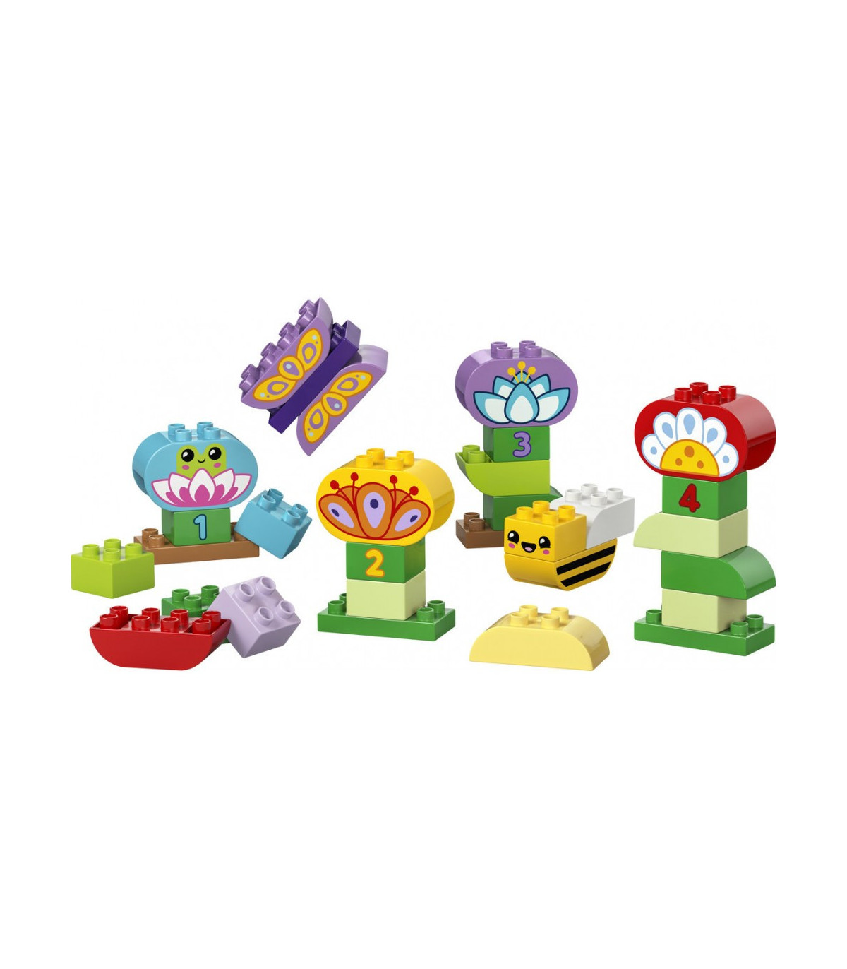 Fomenta la construcción libre y el juego imaginativo con ladrillos de números, flores y animales. Incluye 3 personajes LEGO® DUPLO® (rana, abeja y mariposa) para que los niños interactúen con la naturaleza.