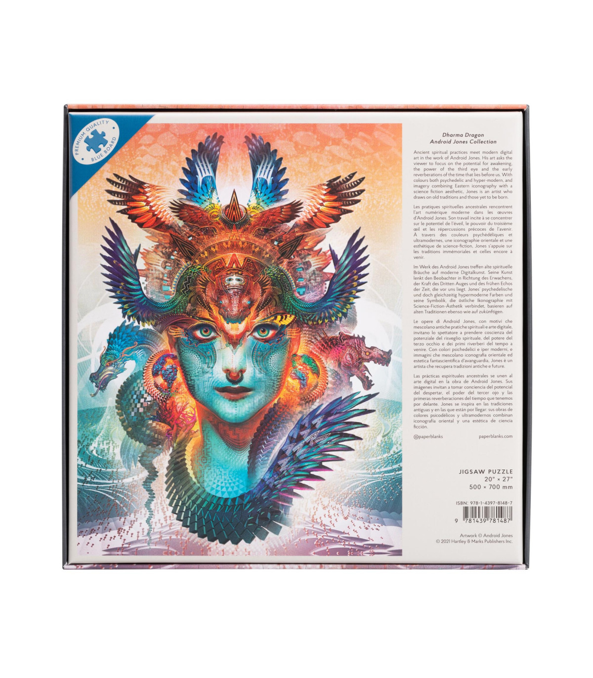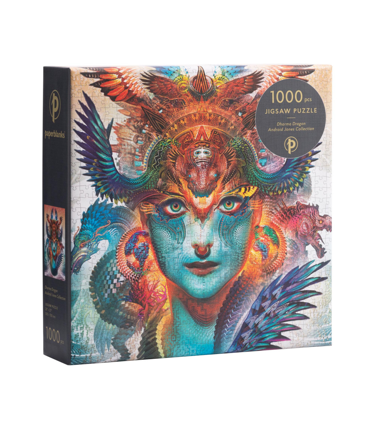 Las prácticas espirituales ancestrales se unen al arte digital en este diseño caleidoscópico que reproduce la obra de Android Jones. Dragón Dharma invita al espectador a tomar conciencia del potencial del despertar espiritual, el poder del tercer ojo y las primeras reverberaciones del tiempo que tenemos por delante.