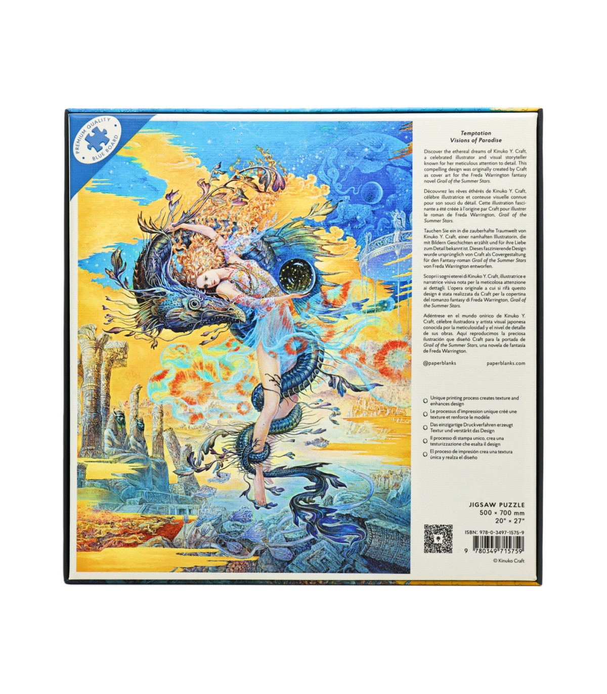 Los puzles Paperblanks presentan algunos de nuestros diseños de más éxito y los muestra como obras de arte. Una vez montados, estos preciosos puzles resaltarán todos los detalles de la obra original. Nuestras espectaculares imágenes y sus 500 piezas aseguran una experiencia desafiante, mentalmente atractiva y una magnífica manera de disfrutar de una tarde en familia. Para su fabricación, usamos los mismos tratamientos que aplicamos a nuestras famosas libretas y utilizamos una composición especial para el cartón dando como resultado unos puzles deslumbrantes y una textura única. También empleamos cartón azul ESKA® de alta calidad y papel 100% reciclado.