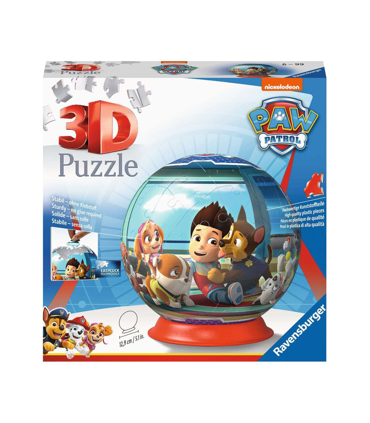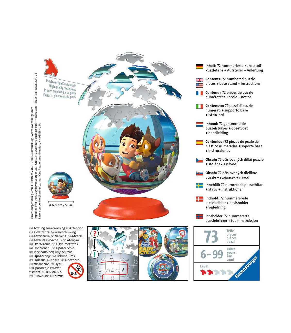 Un puzzle 3D redondo con los colores de los cachorros de la Patrulla Canina, fácil de montar gracias a sus 72 piezas numeradas. Simplemente siga el orden de los números y la dirección de las flechas que se muestran en la parte posterior de las piezas del rompecabezas. Todas las piezas encajan perfectamente gracias a la tecnología Easyclick. Una vez ensamblado, el rompecabezas 3D se mantiene muy estable, no necesita ser pegado y se puede mostrar en su soporte incluido.