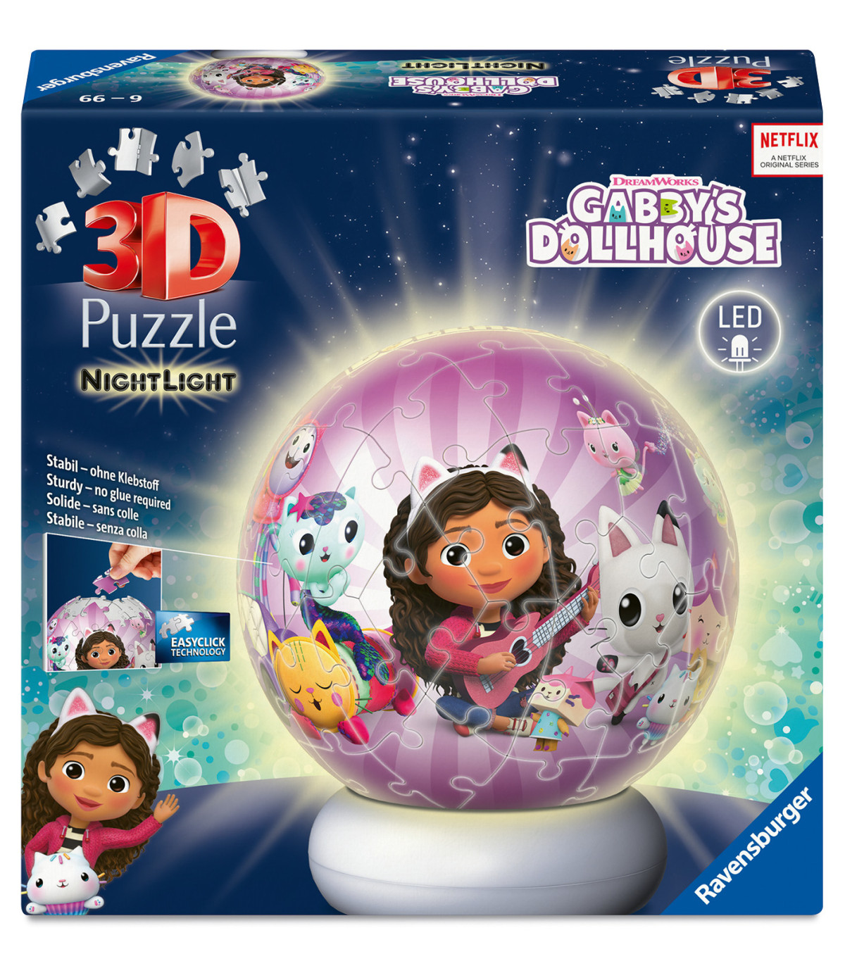 Las luces nocturnas Ravensburger llaman la atención en cualquier habitación infantil, ya sea como elemento decorativo para dormir o como lámpara de noche. La base regulable permite que la 3D Puzzle-Ball brille desde dentro